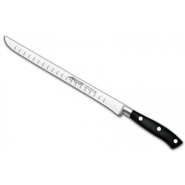 - Couteau à jambon 25 cm : le couteau à jambon est, comme son nom l’indique, spécifiquement conçu pour le jambon. Il vous aidera à découper des tranches parfaitement fines de jambon cru grâce à sa lame lisse et souple qui épouse les formes du jambon.