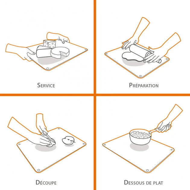 - Utilisations : protection des plaques de cuisson, repose-plat, planche à découper, plan de travail, service