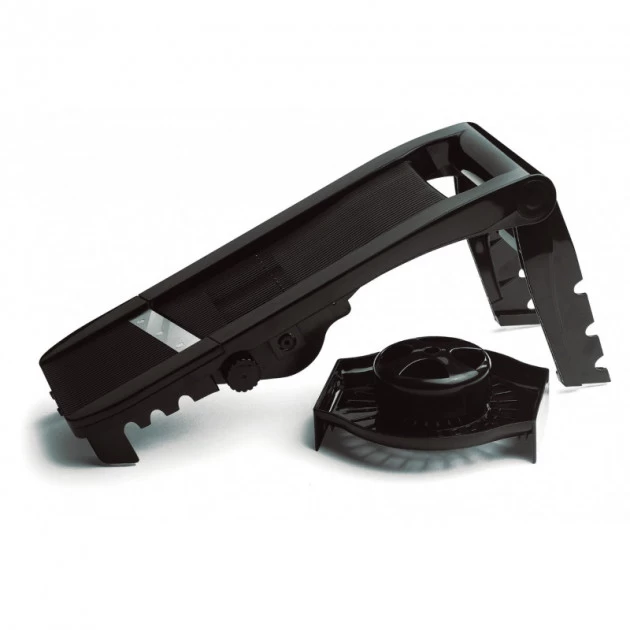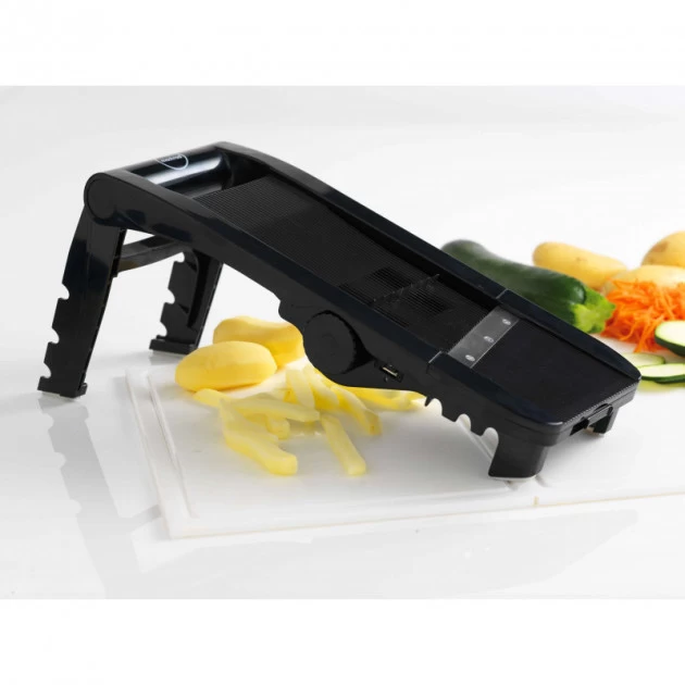 Mandoline Mastrad équipée d’un jeu de 5 lames pour trancher, râper, émincer, découper… Une molette permet de régler l’épaisseur de coupe à souhait, une autre règle la taille des frites et juliennes.