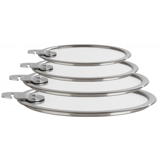 Ces 4 couvercles sont composés de verre trempé avec un cerclage en inox 18/10 : cet alliage assure une grande robustesse ainsi qu’un design moderne et élégant. Ces couvercles de 14 à 20 cm de diamètre sont compatibles avec tous les ustensiles de cuisson de même diamètre ou de la gamme Strate Amovible.