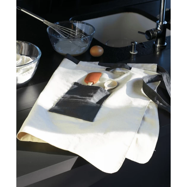 Fabriqué en coton bio, ce tablier est doté d’une double poche pour y mettre vos ustensiles ainsi qu’une sangle en coton pour accrocher votre torchon.